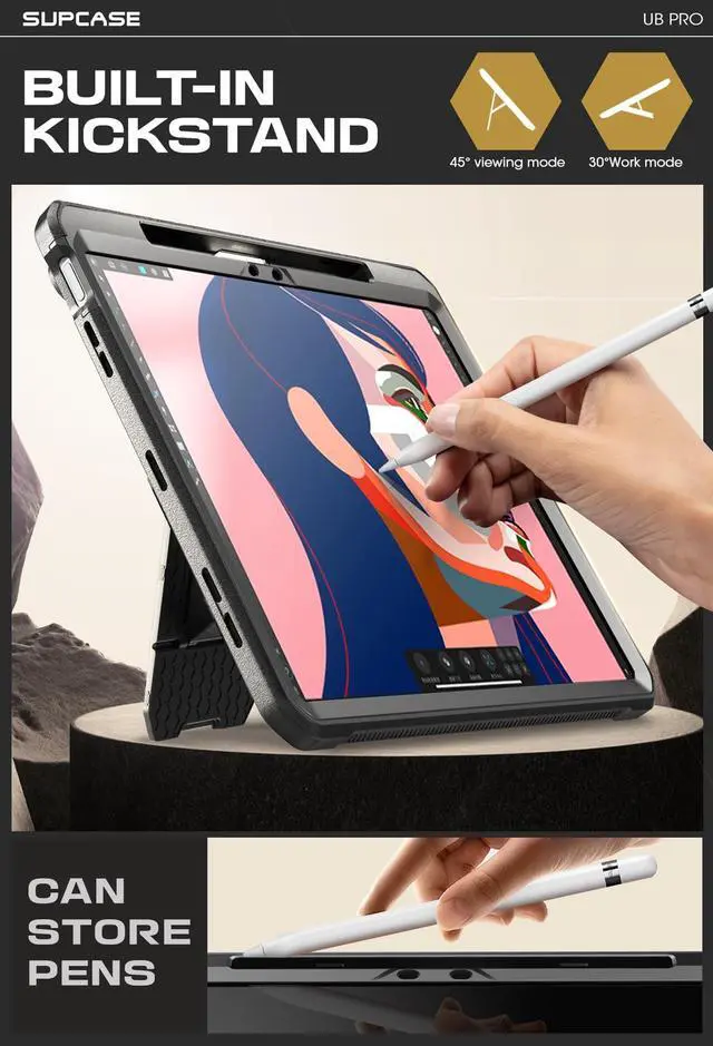 Compatible with iPad Air 13 inch M4 2026 / iPad Air 13 inch M3 2025 / iPad Air 13 inch M2 2024. ^^ Dual-layer hybrid pc shield backplane with shock-absorbing tpu bumber exceeds military quality standards(drop tested at a 48-inch height, 26 times). 5mm higher than the camera precise cutouts and port covers keep out dust & create full body 360 protection. ^^ Functional pop out kickstand allows 45 viewing mode and 30 work mode. Built-in screen protector prevents scratches without compromising sensitivity. ^^ Built-in pencil holder supports the Apple Pencil Pro's magnetic attachment as well as wireless charging and also prevents your pencil from being lost (Note: Pencil is Not included). ^^ Unicorn Beetle Pro lightweght design make it comfortable and portable to hold, convenient for your favorite shows, movies, and games on office / entertainment occasions.