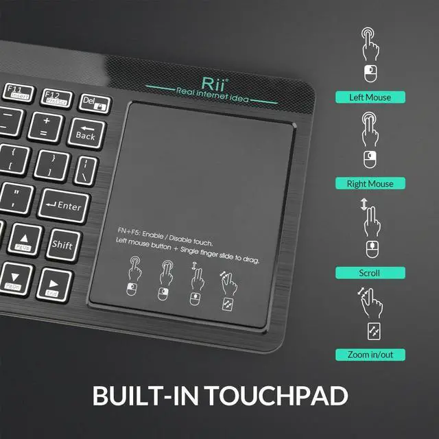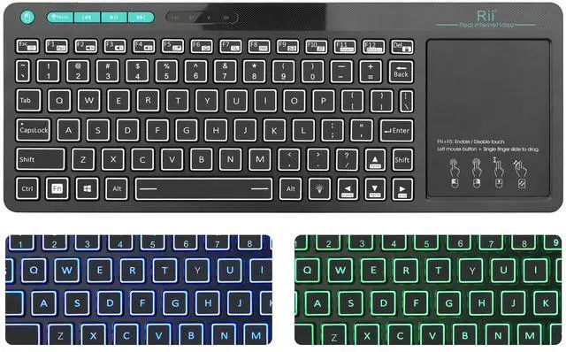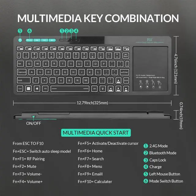 Note: the keyboard size is 12.79 * 4.76 * 0.74 inch; ^^ 2-Colors BacklightWireless 2-Colors Backlight keyboard in Blue and Green colors for a darkness input, please note that this keyboard have not red color. ^^ System Compatibilitythis wireless backlit keyboard with bluetooth and RF 2.4G hz mode could work with Android TV BOX, Tablets, Smart TV, PC, Android, Windows, Mac OS (some media function could not work on Mac OS), ^^ Big TrackpadFirst big size trackpad with sensetive Multi-point function Touch keyboard, Zoom in /out with two fingers. ^^ Multi-Media FunctionsGreen colors Multi Media buttons as shortcut keys, wireless connection keyboard. Please note that the Samsung newest smart TV doesnt support all the functions of the standard keyboard and mouse. ^^ Warranty Term12-month warranty. Any problem during use, send message to support team to help you solve the problems