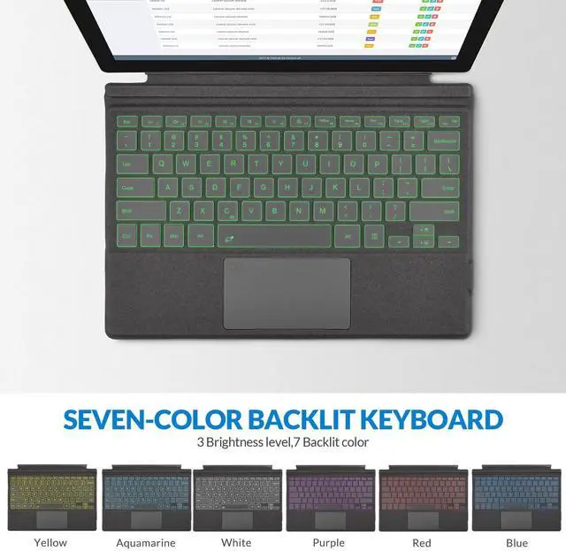 Multi-Touch Trackpad & 7-Color BacklightWireless keyboard for tablet Built-in precision trackpad that can quickly and easily help you improve working efficiency. 12 different multi-touch gestures with convenient function keys enriches experience. 3 levels of brightness and 7 vibrant colors Backlit make work easy in the dark. FN+/ key can change 7 different LED colors.