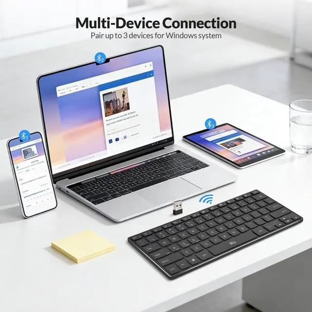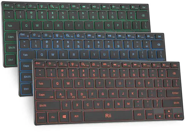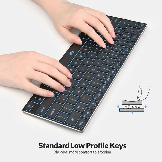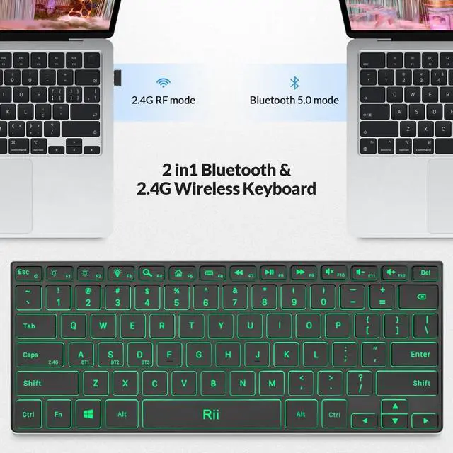 2in1 Computer Keyboard Rii keyboard with 2 connections: Bluetooth and 2.4G USB dongle, in Bluetooth Keyboard model, the keyboard could connect 3 devices at the same time, in wireless keyboard mode, the keyboard could connect by USB dongle, plug and play no need driver ^^ Slim Bluetooth Keyboard Bluetooth Keyboard with Stainless Steel case been slim and lightweight when during travel or business trip. Silent keys makes your never worry bothering the people around you ^^ Backlit Keyboard Wireless keyboard with 3 colors LED backlights Red, Green, Blue. Turn on the Backlight makes your typing cool and clear ^^ Rechargeable KeyboardPortable Keyboard battery could last 22days with working 8hours/day and standby last at least 2 years. Automatically into sleep mode if there is no operation in 30mins to save power. Low Profile scissor key mechanism, it enhances feedback and stability and makes the typing more comfortable and relax your fingers ^^ Broad Compatibility Keyboard with Bluetooth 5.0 and support most of the Bluetooth devices with Windows8/10/11, including Surface/Android Tablet like Samsung Galaxy Tab, Google Nexus /PC/Desktop/Smart TV /Android TV Box/Raspberry Pi, etc ^^ Custom serivceAll Rii products provide Warranty 12 months and 7*24 customer Service, if you have any problem of the keyboard, you could contact us in time