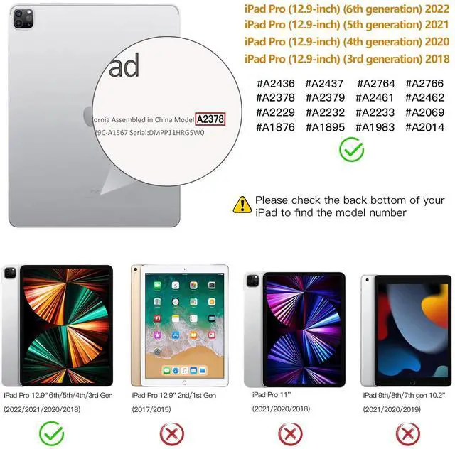 Compatibility: The Akkerds cases fit the iPad Pro 12.9 case 6th generation 2022 (Model: A2436/A2437/A2764/A2766), iPad Pro 12.9 case 5th generation 2021 (Model: A2378/A2379/A2461/A2462), iPad Pro 12.9 case 4th generation 2020 (Model: A2229/A2232/A2233/A2069), iPad Pro 12.9 case 3rd generation 2018 (Model: A1876/A1895/A1983/A2014). Please checked the model on the back bottom of your iPad