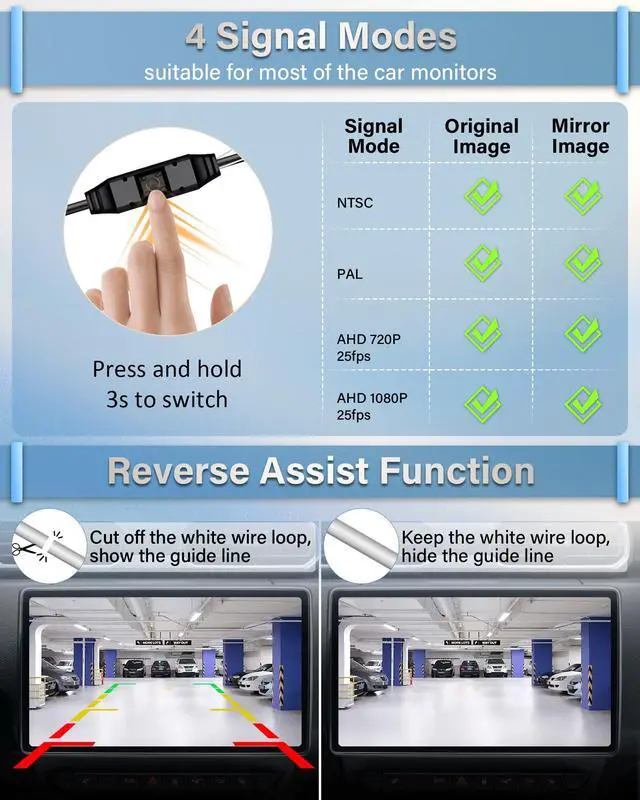 • Upgrade Switchable ButtonJansite newest backup camera supports 8 video formats, wide compatibility with 95% factory-fitted head unit. (Supports AHD 1080P/720P 25fps/CVBS-NTSC/PALMirror image and Original imagePress and hold the switch button for 3 seconds until the screen responds to cycle to the next format. There is no need to go through the complicated wire-cutting operation!