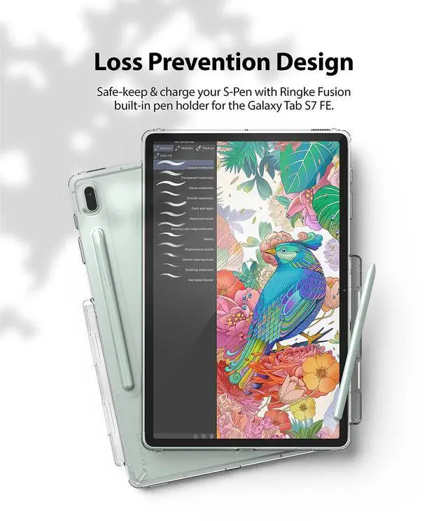 See-through back shows off original design of device ^^ Drastically lessens impact from heavy fall damage and accidental drops ^^ Raised lips protects front display from potential scratches and damage ^^ The built-in pen holder is designed to hold the S Pen safely in place and allow quick access ^^ Attach hand or neck straps with the built-in dual QuikCatch lanyard holes. (Strap sold separately)