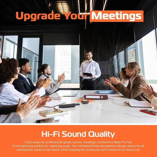 NOISE REDUCTION TECHNOLOGY: Conference Mate Pro features high quality noise elimination technology, eliminate distracting noises from your online meetings. such as air conditioning noise, keyboard clicks, and general background noise. Our noise-cancellation technology makes the computer speaker with microphone a must-have device in your home office. Elevate your remote meetings with our conference room microphone and speaker! ^^ HI-FI SOUND QUALITY & SPEECH ENHANCEMENT: Crisp audio for professional-grade remote meetings. Conference Mate Pro has 6 microphones perfect for capturing audio. Our omnidirectional microphone design allows for all participants voices to be heard, while keeping the sound you don't desire to be heard out. The bluetooth speakers with microphone is able to identify the sound source automatically and adjust to a self-volume balance. Ensuring smooth meetings and impressive sound quality. ^^ IMPRESSIVE 360