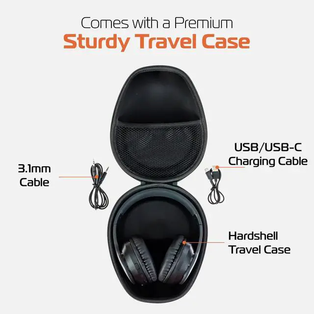 ^^ Includes 3.5 mm Aux Cable and Travel Case Use wired or wireless; pack up your headphones safely with the included hard-shell case for easy portability.