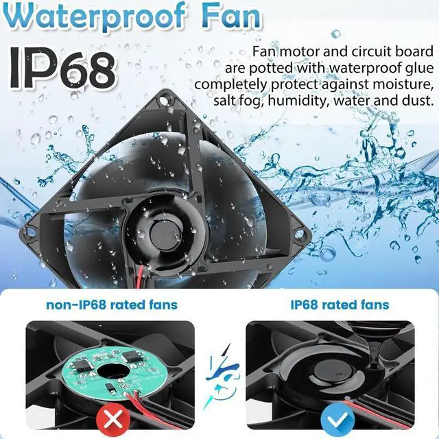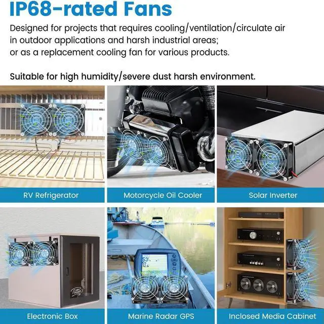 These compact fans are ideal for use in confined spaces. They offer high airflow and low noise operation. FeaturesIP68 rated Waterproof and DustproofClosed-type design for outdoor protectionFor humid and dust-exist harsh environmentEnhanced High Airflow Excellent Cooling Performance50, 000 Hours Long Lifetime OperationFor high temperature operating with two ball bearing typeApplicationsGreenhouse ventilation cooling fanGrow room tent ventilation cooling fanRV Refrigerator ventiltaion cooling fanOutdoor Telecom cabinet cooling fanOutdoor equipment cooling fanHarsh industrial areasTelecomIndustrial automation