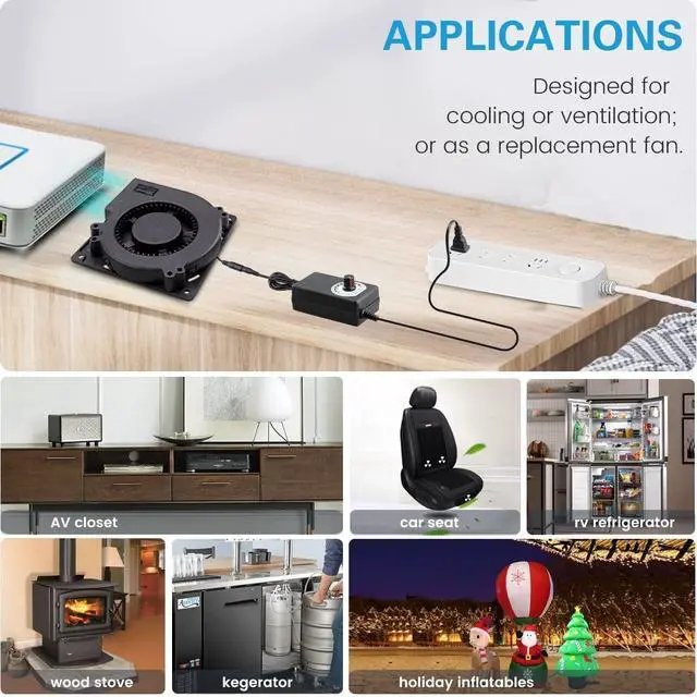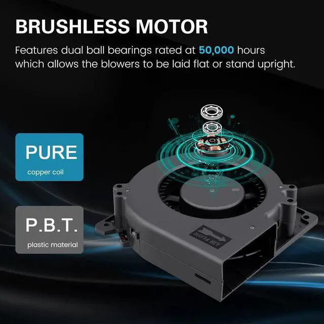 Long-Lasting: the blower contains dc brushless motor with P. B. T. housing and dual ball bearings, rated at 50, 000 hours allows the fans to be laid flat or stand upright ^^ The power adapter increases maximum fan speed and enables the fan to be powered through an AC outlet.