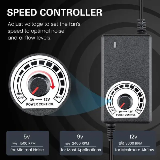 Output: DC 3-12V-2A; with power switch to set the fans speed to optimal noise and airflow levels for various applications and noise environments ^^