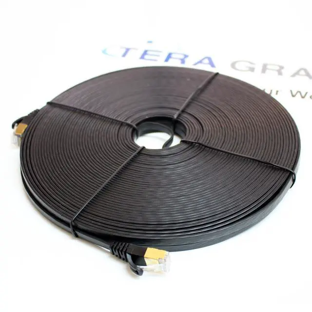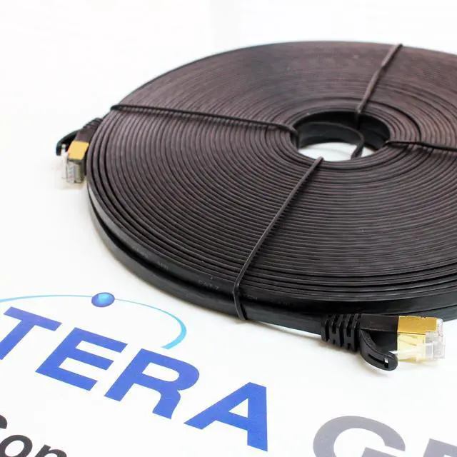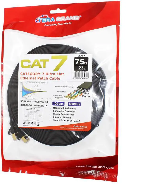 Tera Grand - 75FT - CAT7 10 Gigabit Ethernet Ultra Flat Patch Cable for Modem Router LAN Network, Gold Plated Shielded RJ45 Connectors, Faster Than CAT6a CAT6 CAT5e, Black