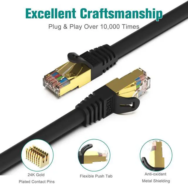 Tera Grand - Premium CAT7 Double Shielded 10 Gigabit 600MHz Ethernet Patch Cable for Modem Router LAN Network, Gold Plated Shielded RJ45 Connectors, 75 ft Black