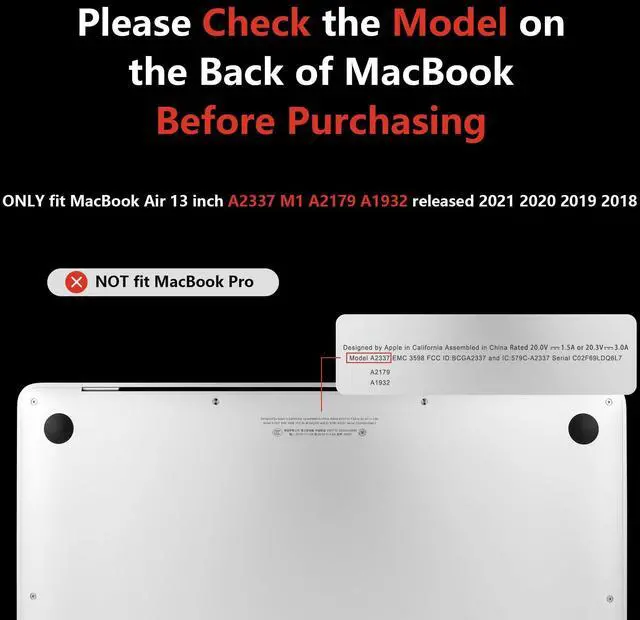 • Check Model for MacBook: Case is designed for MacBook air 13.3 inch 2021 2020 2019 2018(Only compatible model: A2337 M1/A2179/A1932) with touch ID & retina display. Please check the specific model "AXXXX" on the back of MacBook before purchasing