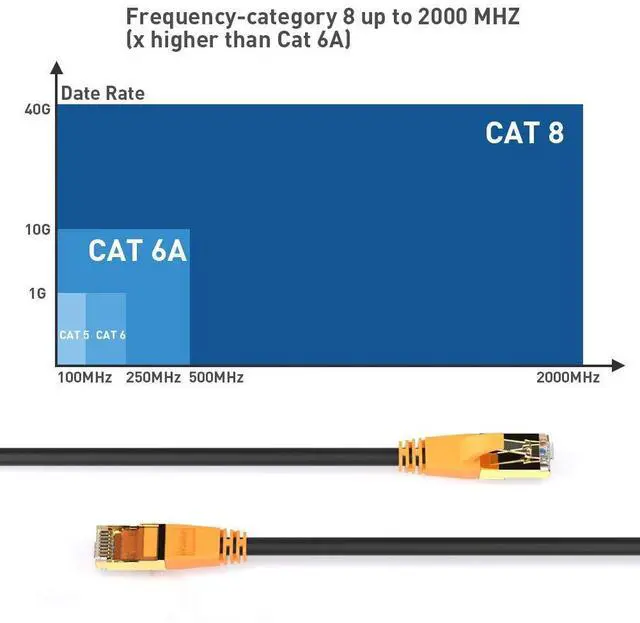 3. Cat 8 cable includes individually foil-shielded bare copper connectors encased in a overall steel braid; Fully shielded metal connectors have gold-plated RJ45 contacts and a snagless boot with molded strain relief; Tested to support up to 2000 MHz (2 Ghz) that is 4x the frequency of Cat 6A cable or Cat7 cable