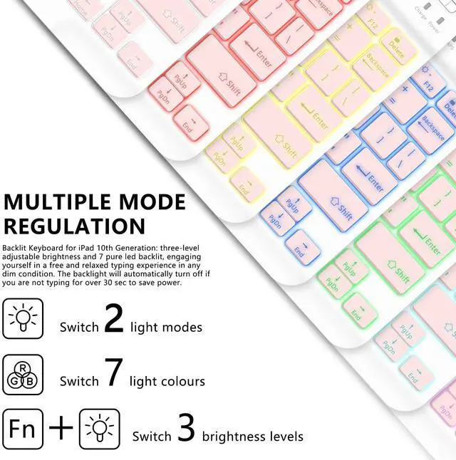 [LED Backlit Keyboard] 2 light modes (Monochromatic and gradient light), three-level adjustable brightness and 7 pure led backlit, engaging yourself in a free and relaxed typing experience in any dim condition. The backlight will automatically turn off if you are not typing for over 30 sec to save power.