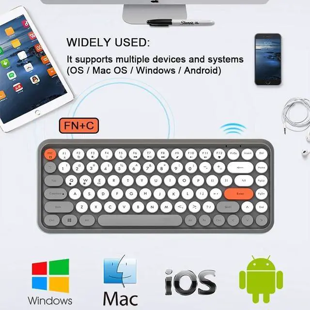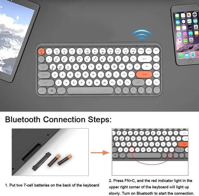 Compact & Fashion Bluetooth Keyboard: This Typewriter wireless Bluetooth keyboard has 84 round keys. It is compact and easy to carry. The fashion shape is inspired by the retro elegant typewriter shape, the unique round keycap. Just press FN + C keys to enter Bluetooth mode.