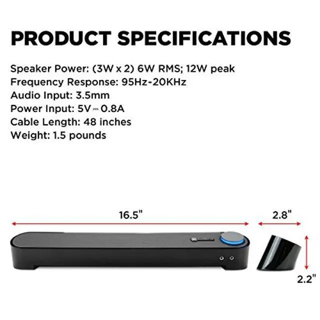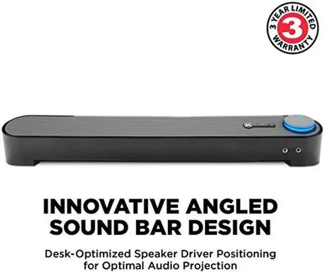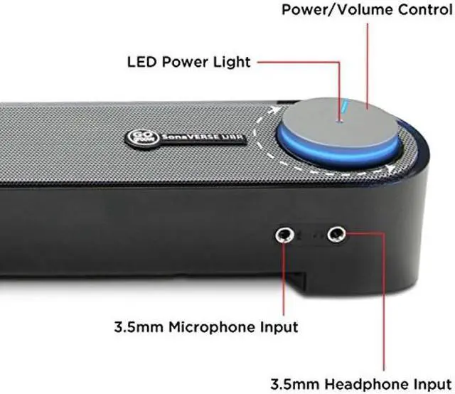 Thanks to its low-profile design, the UBR can tuck directly under your monitor screen, conveniently utilizing that wasted space and freeing up room on your desk. This ultra-compact stereo sound bar is the perfect alternative to the clutter and cables of desktop speakers. USB-Powered; Headphone and Microphone portsTurn the speaker on, off, and adjust volume with a single control dial, which (when on) is illuminated by a soothing blue LED indicator. To set up the speaker, just plug the USB power cable and the 3.5 mm speaker and microphone jacks into your computer - there's no software to install or bulky AC power adapters to deal with.