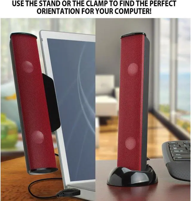 INCLUDES LAPTOP CLIP & DESK STAND Mount the speaker on the top or side of your monitor with the included clamp OR use the included standing base for desk tabletop placement