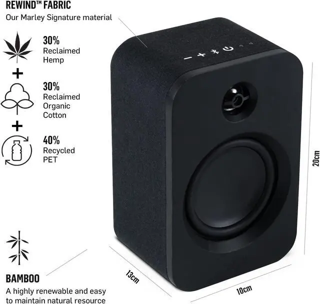 SUSTAINABLY CRAFTED: The Get Together Duo speakers are crafted from bamboo and REWIND Fabric, a balanced blend of 30% reclaimed organic cotton, 30% reclaimed hemp and 40% recycled PET