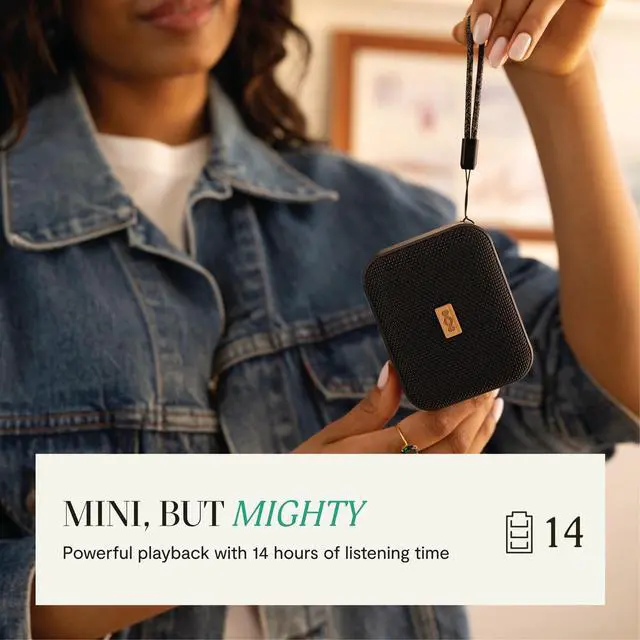 Despite its small, portable size, this speaker delivers powerful audio and is easy to carry with its included lanyard. Staying true to House of Marley's commitment to sustainability, the Jammin' speaker is made from recycled plastics, recycled fabrics, and Regrind silicone, minimizing its impact on the environment. Its eco-conscious design reflects our dedication to creating products that not only deliver exceptional sound but also respect the planet. With the Jammin' portable Bluetooth speaker, you can enjoy your music anywhere while making a positive impact on the world.