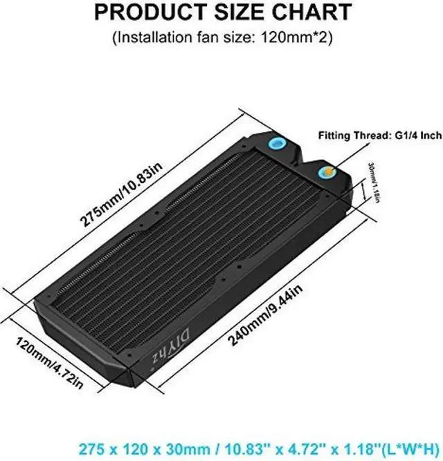 Product Name: Water Cooling Radiator; Outer Size: 275 x 120 x 30mm / 10.83'' x 4.72'' x 1.18''(L*W*H), Weight: 690g.