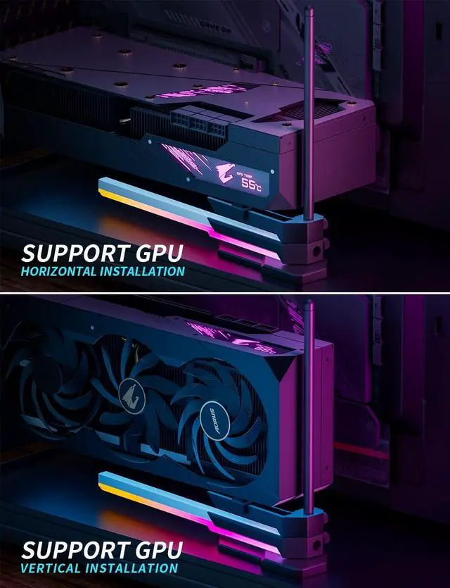 < Widely Compatible > Compatible with all PC cases, without occupying PCIe slots, and supports all graphics cards including Nvidia RTX 3000 and AMD RX5000/6000 series. ^^ < Strong Support > Provides a support height of 28mm-200mm, with 360-degree adjustable rotation, supporting multi-directional support. The silicon pad on the support frame is designed to avoid interfering with the graphics card fan and affecting the graphics card airflow. ^^ < Tool Free > Easy installation with manual screw design, no tools required for installation and disassembly. ^^ < Stable Base > 121mm elongated base design, avoids interference with the bottom fan of the case, with extra-large anti-slip silicone footpads.