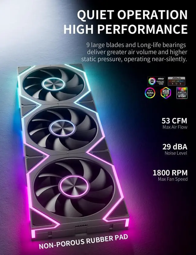 ^^ Quiet & High-PerformanceExperience reliable cooling with this 120mm PC case fan equipped with high-performance hydraulic bearings. As a top-tier pc fan, it minimizes friction, reduces noise, and extends lifespan, delivering stable 53 CFM airflow and adjustable 800-1800 RPM speed for efficient system temperature controlperfect for silent yet powerful computer fan needs. ^^ Stealth-Cover Foot PadsFeatures foot pads with no screw holes of their own, designed exclusively for 120mm case fans and pc case fans. Beyond effectively damping vibration and reducing noise for your pc fan, they seamlessly conceal the installation screw holes, crafting a sleek, distraction-free interior for your PC case fans setup.