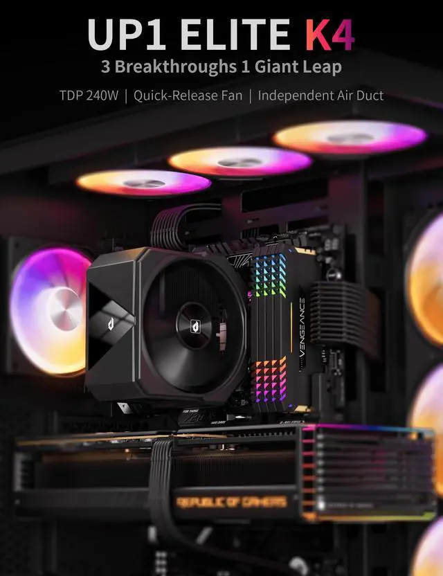 ^^ Quick-Release Fans & Hassle-Free InstallationNo fan removal required during installation, simplifying setup. For maintenance, clean or swap fans instantly via tool-free clip-on design. 100% RAM clearance guarantees full compatibility with tall RGB memory modules