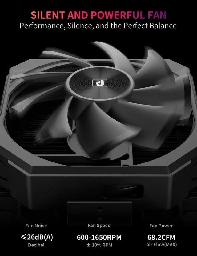 Universal CPU CompatibilityA unified mounting bracket kit supports all major Intel (LGA1851/1700/115x/2011/2066) and AMD (AM4/AM5) sockets. The tower cooler features a rapid installation designno fan detachment is needed at any stage, from unboxing to final setup. One kit fits virtually all modern gaming/desktop builds. ^^ Premium Mirror AestheticsSleek black mirror top cover delivers a sophisticated, reflective finish that enhances your PC's visual appeal with a minimalist and modern touch. ^^ GPU-Isolation Air Duct TechnologyInnovative independent airflow channel prevents GPU heat interference, optimizing CPU cooling efficiency by maintaining focused thermal management. ^^ Ultra-Quiet High-Performance FanEngineered for silent operation (26dB) with dynamic 600-1650RPM PWM control and 68.2CFM max airflowperfectly balancing power and quiet cooling.