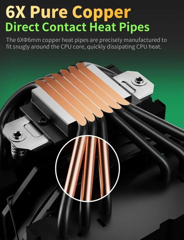 ^^ Exceptional Cooling Performance: Features six 6mm heat pipes and dual towers, our cpu cooler dissipate heat efficiently from your CPU for optimal performance. Enhances heat dissipation capacity with two towers and a direct heat pipe contact area of 30mm, the cooler for pc ensures effective cooling even under heavy workloads. ^^