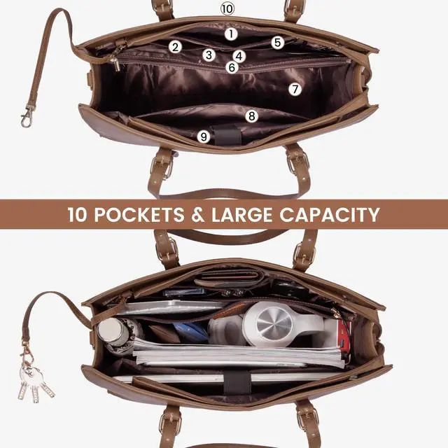 [(Multi-pocket Design)] Multiple pockets keep your belongings organized. The handbag structure consists of a 15.6-inch laptop pocket, an iPad pocket, a middle zipper pocket, an internal side zipper pocket, two large opening compartments, two