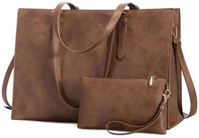 LOVEVOOK Laptop Bag for Women, Vintage Leather Works Computer Tote Bag, 15.6 -Inch Large Capacity Shoulder Bag Set with Clutch Purse, Professional Business Briefcase for Office Lady, 2Pcs, Brown