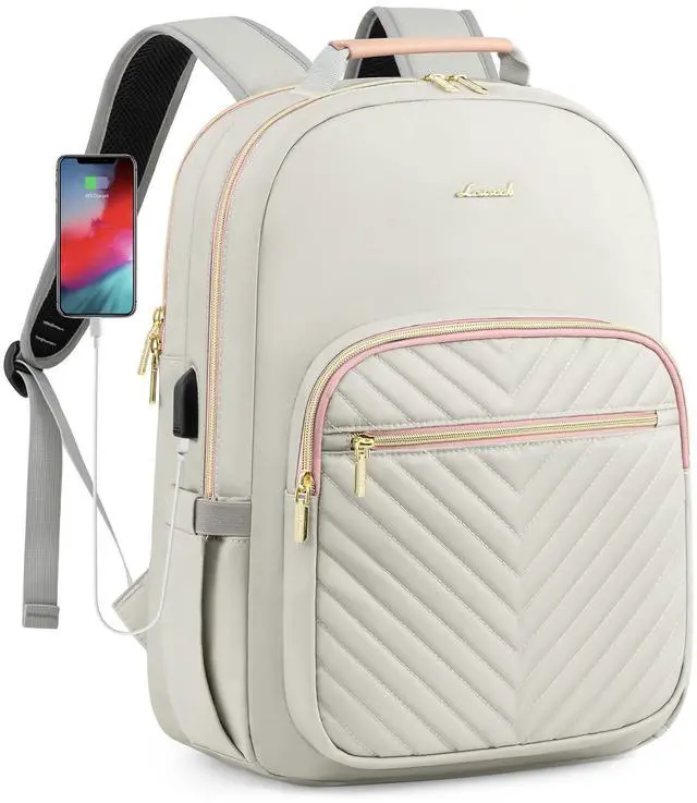 LOVEVOOK Laptop Backpack Purse for Women, Work Travel Computer Bags, College School Backpack for Student Girl, Quilted Casual Daypack with USB Port, Fit 15.6 Inch Laptop, Grey Pink