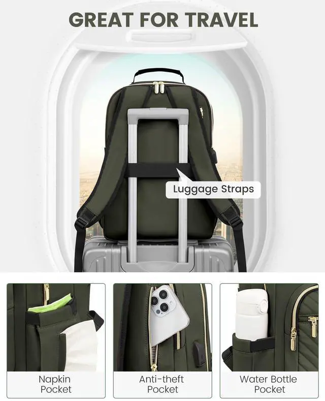 LARGE CAPACITYThis backpack purse looks delicate & stylish, but can hold everything you need on the go. The travel backpack has multiple compartments to hold the laptops, iPads, phones, charger, binders, bottles, umbrellas, magazines, clothes, pens, wallets, and more. ^^ MULTI-COMPARTMENTS & POCKETSThis women's business work backpack is designed with 4 compartments and 17 pockets. Ample pockets keep your travel items organized. ^^ LAPTOP PROTECTIONThe laptop backpack is designed with 15.6 -inch laptop separate compartments and a 12.9 -inch iPad slot; with cushioned cotton sewn around, it maximizes physical protection of your electronic devices.