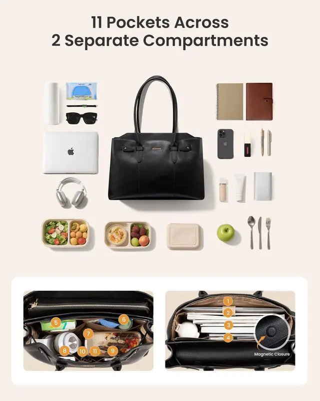 • Dual-Compartment CapacityUnlike most work tote bags for women with only one divider, this LOVEVOOK laptop bag for women features two roomy compartments. Perfect for keeping a 17 laptop, A4 folders, and daily work essentials neatly organized.