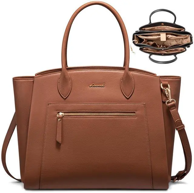 (Size: 18" x 13" x 5.5" ) ^^ Smart Organization with 3+11 PocketsFeatures three main compartments and 11 pockets for total organization. Includes a large water bottle pocket, padded 15.6" laptop sleeve, tablet sleeve, front slip pockets (with key leash), pen holders, and an exterior zipper pocketkeeping all your business and office essentials neatly in place. ^^ Durable & Comfortably ConvenientMade from scratch-resistant, waterproof vegan leather for lasting looks and easy care. It features reinforced handles, a wide padded shoulder strap for comfortable heavy loads, and protective metal feet. The smooth zippers and reliable magnetic clasp ensure quick, secure access you can trust every day. ^^ Ready for Work, College, TravelWhether you need a teacher bag, business purse, computer tote, or travel work bag, this one bag is ready to go everywhere with you. ^^ Gift-Worthy for Stylish WomenAn elegant, functional gift for moms, teachers, professionals, construction worker or studentsstyle meets practicality.