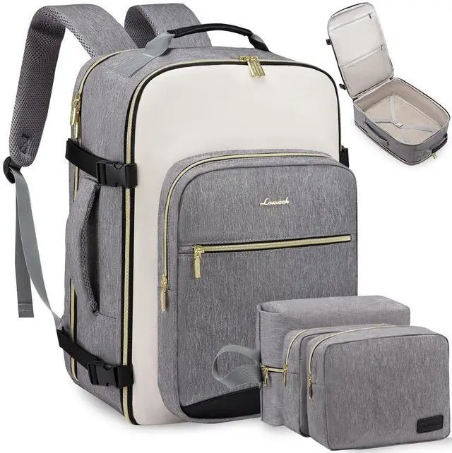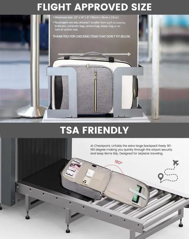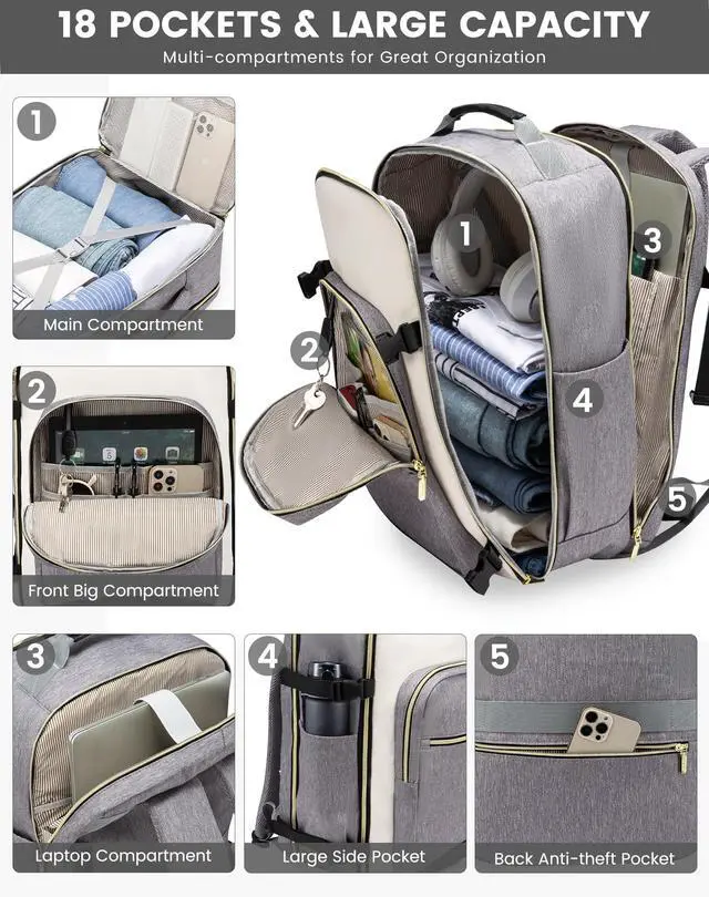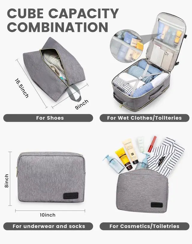 ^^ 3 Extra Packing Cubes & Wet PocketsThis carry on backpack comes with 1 shoe bag, 2 storage bag and 1 built-in wet Compartment pocket; personal item travel bag convenient for storing wet clothes, wet towels, toiletries during travel to prevent any leaks or moisture from affecting your other items. ^^ Durable & ComfortableMade from durable material that resists tearing, water and abrasion, this backpack is built to withstand the rigors of travel. Ergonomically designed with adjustable vented shoulder straps and a padded back panel and shoulder straps. ^^ Practical & Safe DesignThis travel backpack for women is designed with a 180-degree expandable suitcase-style opening, which is very convenient for accessing items during security checks; a padded electronics compartment on the back ensures safety; umbrella/water bottle pockets on the side and a luggage strap on the back.