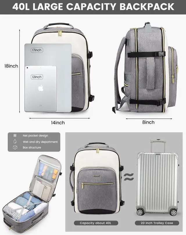 Airline Approved Personal ItemThe size of the carry on backpack is 18*14*8inch. it can fit perfectly in the overhead luggage compartment or under the seat, allowing you to bring it on board as your personal item. This carry-on backpack is designed to meet the size requirements of most major airlines, including Spirit, Frontier, Easy Jet, Jet Blue, and other budget carriers. ^^ Large Capacity & Multiple PocketsThe travel backpack has a storage capacity of up to 40L, with four main compartments and a lot of small pockets designed to allow you to easily separate and organize your items; it can meet your travel items for 3-7 days.