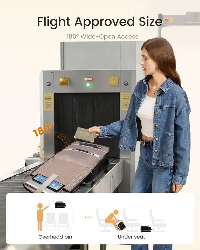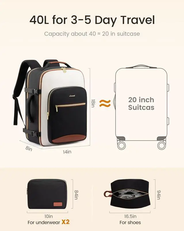 Versatile & Airline ApprovedMeasuring 18*14*8 inches, this carry on backpack fits under the seat or in the overhead compartment, approved by Spirit, Frontier, JetBlue, and other budget-friendly airlines, making it the perfect personal item for air travel. ^^ Spacious & OrganizedWith a 40L capacity, 4 compartments, and a lot of pockets, this travel backpack offers ample space to organize clothing, accessories, and daily essentials, helping keep items separated and easy to access. ^^ 3 Extra Packing Cubes & Wet PocketsThis carry-on bag includes 3 extra packing cubes 2 storage bags and a shoe bag as well as a built-in wet compartment pocket.
