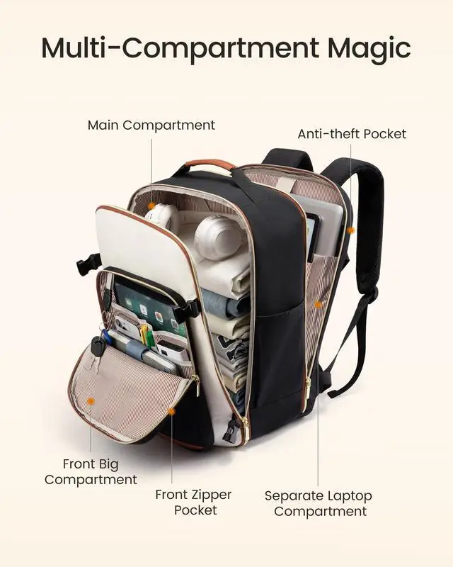 Perfect for storing wet clothes, towels, and toiletries, these packing accessories ensure your belongings remain dry and prevent any leaks or moisture from affecting your other items. ^^ Durable & ComfortableBuilt to withstand the challenges of travel, this carry on backpack is made from tear-resistant, water-resistant, and abrasion-resistant materials. It also has adjustable shoulder straps, a padded back panel, and shoulder straps, ensuring comfort during long trips; a travel essential. ^^ Secure & PracticalThis large travel backpack features a suitcase-style opening for easy access to your belongings at security checkpoints.