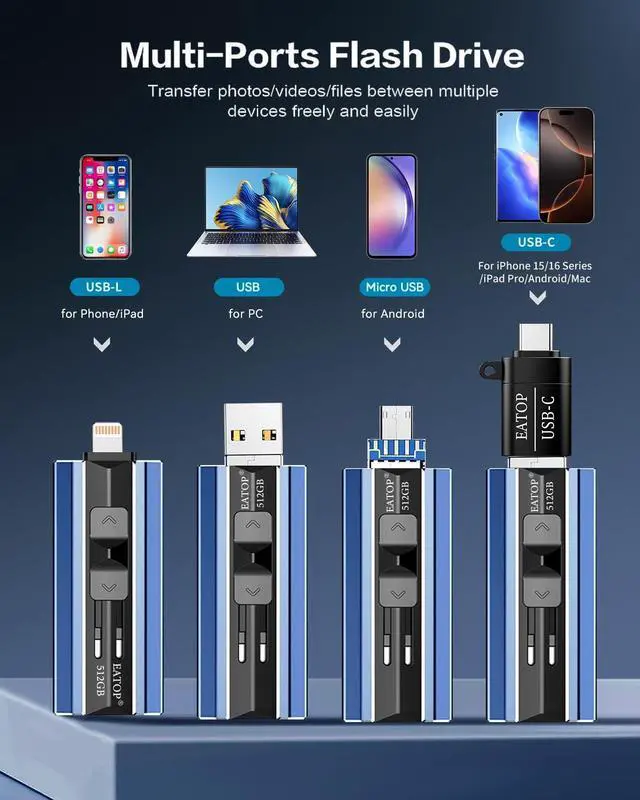Plug and Play, No Application Required, Instantly Increases Phone and Tablet Memory SpaceIf you almost used up all space on your Phone or Tablet, this photo stick for Phone helps to expand your memory at full storage with 512GB. The usb memory stick for photos is also a great partner for traveling photographers editing on Tablet. Using this memory device for your Phone, Tablet or Computers, no worries with the Phone storage anymore! ^^ Plug and Play, No Application Required, Instantly Increases Phone and Tablet Memory SpaceIf you almost used up all space on your Phone or Tablet, this photo stick for Phone helps to expand your memory at full storage with 512GB.