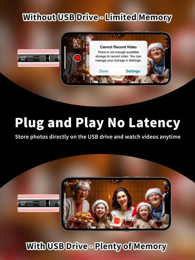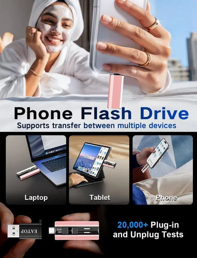 (Note: For iPhone/iPad No App Required; For Android only Needs OTG Enabled, No Extra App. ) ^^ Universal Compatibility with Dual InterfacesFeaturing USB-C, USB-L, USB ports adapter, this Compatibility iPhone photo storage stick connects seamlessly with iPhone/iPad devices, Android OTG phones, laptops, and tablets. No iCloud fees, no internet requiredjust plug in and move files freely between your phone, computer, and other devices. ^^ Blazing Fast Transfers AnywhereFeaturing upgraded high-speed chips, this portable phone external storage drive enables instant mass file transfersup to 30 MB/s read speed and 15 MB/s write speedno WiFi or data cables required. Save time sharing photos, moving large video projects, whether youre traveling, working, or creating content on the go. ^^ Easy Backup, Enjoy Anytime AnyplacePlug-and-play & simple to operatequickly back up videos, photos, contacts and documents without tedious copying or pasting. No third-party apps required; just plug the drive into your iPhone, iPad or Android device and operate via the "Files" app. You can also share files directly from the iPhone photo stick to social media, instantly sharing wonderful moments with friends and family.