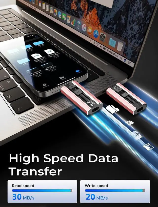Higher: Simply insert the flash drive into your iPhone iPad, then go to the "Files" app, Click back to Browse and find the flash drive named Untitled, Move photos videos and files to your iPad or iPhone as needed. ^^ How to transfer in Android PhonesAndroid phones need to support OTG, and flash drives can be found in the File Manager of most Android devices. ^^ Kindly NoteThe phone case may prevent the proper connection between a phone and a usb flash drive, which could result in the phone being unable to recognize the usb flash drive. In this situation, please do not conclude that the usb flash drive cannot be used, remove the phone case and try again. ^^ Kindly NoteFor Flash Media Devices, 1 megabyte = 1 million bytes; 1 gigabyte = 1 billion bytes. Actual useable capacity may vary. Some of the listed capacity is used for formatting and other functions, and thus is not available for data storage. ^^ Kindly NoteUp to 30MB/s read speed, write speed is lower. Based on internal testing; performance may be lower depending on the host devices and users settings and configurations.