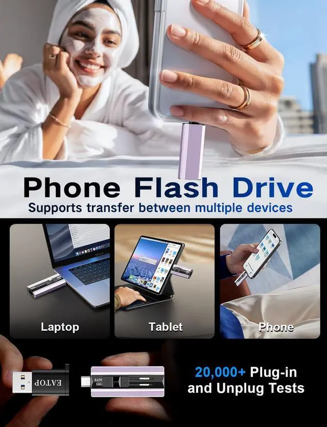 (Note: For iPhone/iPad No App Required; For Android only Needs OTG Enabled, No Extra App. ) ^^ Universal Compatibility with Dual InterfacesFeaturing USB-C, USB-L, USB ports adapter, this Compatibility iPhone photo storage stick connects seamlessly with iPhone/iPad devices, Android OTG phones, laptops, and tablets. No iCloud fees, no internet requiredjust plug in and move files freely between your phone, computer, and other devices. ^^ Blazing Fast Transfers AnywhereFeaturing upgraded high-speed chips, this portable phone external storage drive enables instant mass file transfersup to 30 MB/s read speed and 15 MB/s write speedno WiFi or data cables required. Save time sharing photos, moving large video projects, whether youre traveling, working, or creating content on the go. ^^ Easy Backup, Enjoy Anytime AnyplacePlug-and-play & simple to operatequickly back up videos, photos, contacts and documents without tedious copying or pasting. No third-party apps required; just plug the drive into your iPhone, iPad or Android device and operate via the "Files" app. You can also share files directly from the iPhone photo stick to social media, instantly sharing wonderful moments with friends and family.