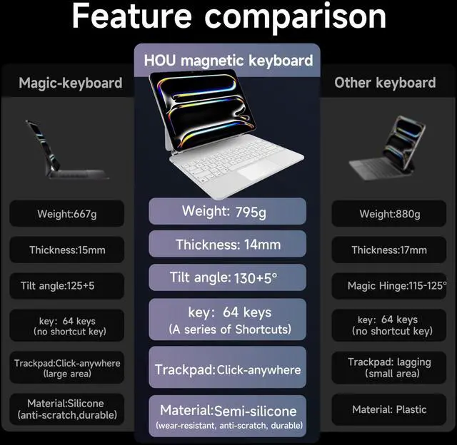 [Secure Attachment, Peace of Mind Protection]: The HOU iPad Pro 13 inch 2024 keyboard case uses strong magnets that perfectly align with the iPad Pro, ensuring a secure attachment.This magnetic design enhances stability and protects the iPad from slipping