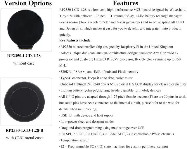 The RP2350 microcontroller chip with onboard 1.28inch 240x240 pixels 65K colorful IPS LCD display for clear color pictures. Adapting all GPIO and Debug pins, which makes it easy for you to develop and integrate it into products quickly. (Note: This version is with CNC Metal Case )