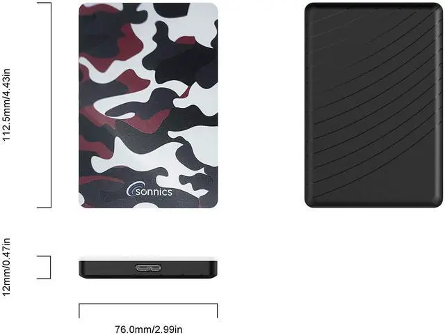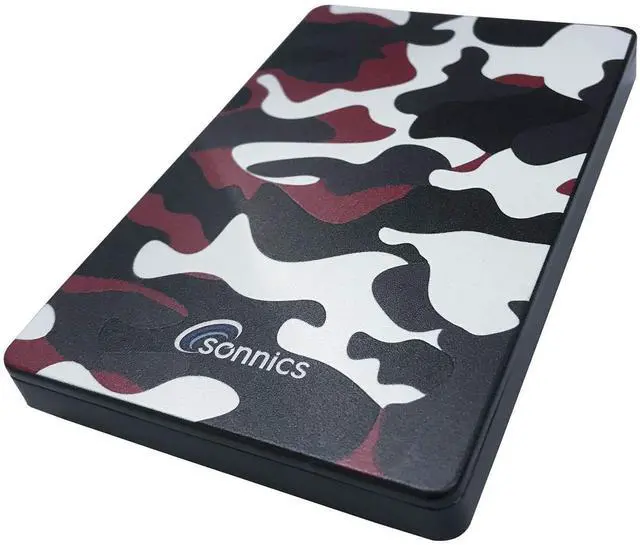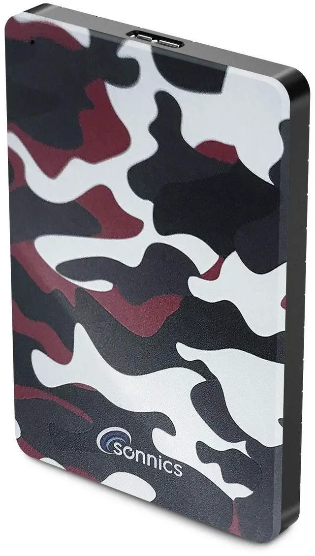 Sonnics 1TB USB 3.1 Type C External Portable Hard Drive is stylish and fast with data transfer rates of up to 5 Gbps. Connect it to your smart TV, record all your favourite movies and TV shows on the hard drive and play them again whenever you want. The aluminium housing provides excellent heat dissipation and helps your drive, stay cool. Back up data and transfer all your files quickly with this new 2.5" portable hard drive. Comes in red camouflage colour.