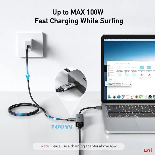 100W Charging Port: Charge your devices quickly with up to 100W charging port. uni Ethernet Adapter Power Deliver allows simultaneous charging and network connectivity, eliminating the need to sacrifice charging capability when using the network cable. (Note:If you can't charge your device or the charging rate isn't reaching its maximum, please check the protocol support of your device.)