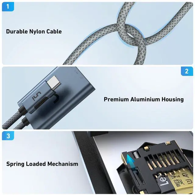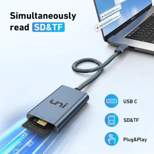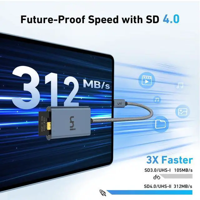 SD 4.0 LIGHTNING-FAST ACCESS: uni usb c SD 4.0 Card Reader is equipped with UHS-II SD card slot, supporting super high-speed data transfer up to 312 MB/s. 3x speed increase over UHS-I. Transfer large photos and videos in the blink, ensuring you never miss a moment of creativity. Perfect for photographers, videographers, and content creators.