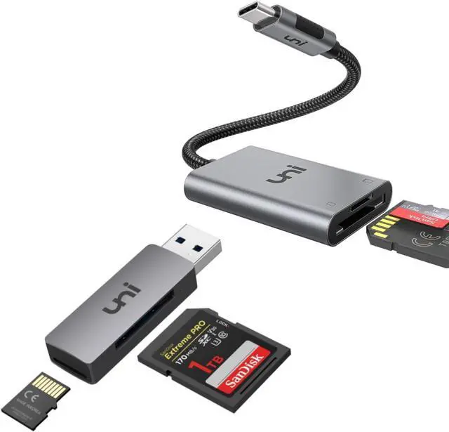 Note: THE ACTUAL SPEED depends on your devices. ^^ Instant SharingPlug and play, the uni USB Type-C Card Adapter helps you share life instantly with friends anytime, anywhere. Everyone is totally able to be a YouTuber or a Tik Toker by editing your travel vlogs and uploading every one-shot stunning moment through it. And such a large card capacity, up to 2TB, that never let you worry about running out of phone memory. Simultaneously Read & Write on two cards to save effort of unplugging and re-plugging. ^^ Superior DurabilityWith optimized connector, aluminum body, durable braided nylon cable, and premium chips, this converter can withstand being used over years, supporting stable data transmission even outdoors. Does Not Recommended for SD Cards with a Lock Tab. ^^ Thoughtful DesignDesigned with a piece of cable, this USB C memory card reader won't block the other ports of your computers. The anti-skid design prevents you from slipping off your hands easily and causing damage. Spring Loaded Mechanism, easy in and out. Plug & Play, USB-C On the Go provides convenient memory card access whenever needed.