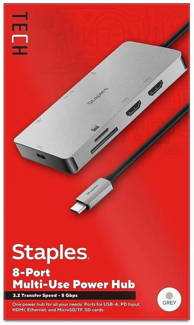 Connect up to eight devices for complete connectivity and a seamless work space at home or the office. Enjoy a fully connected work space with the Staples TECH Eight Port Hub. Equipped with all the essentials - including USB-A, USB-C, HDMI, Ethernet, and ports for SD cards - this will be the only hub you need. Boasting Power Delivery and USB 3.2 technology this hub promises fast charging and high speed data transfer speeds up to 5 Gbps. Its compact design will fit neatly on your desk and reduce clutter.