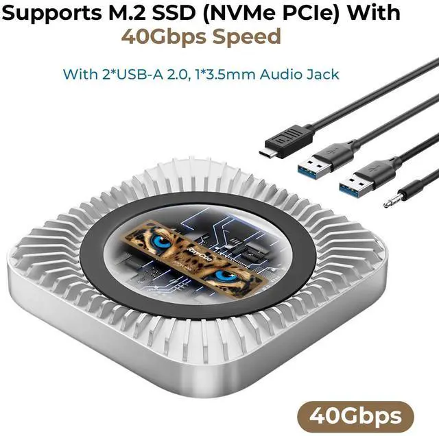[(Multifunctional Expansion & High-Capacity Storage)] This Mac Mini Hub combines a mount and docking station, featuring 1x NVMe SSD enclosure (supports 2230/2242/2260/2280 sizes, up to 40Gbps), 2x USB-A 2.0 ports (480Mbps), and a 3.5mm audio jack. It significantly expands the functionality and storage capacity of your Mac Mini M4, supporting SSDs up to 8TB for enhanced performance.